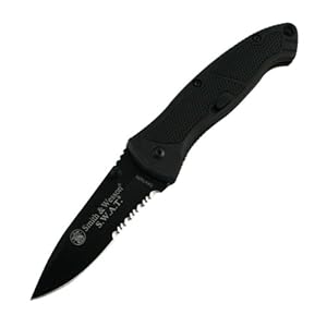 Product Description : From the ManufacturerSmith & Wesson's SWATMBS Swat knife has a 3.15-inch blade and weighs 3-1/2 ounces. The blade is made of coated stainless steel, and the handle is black aluminum with inserts. It has a spear point to go along with the serrated blade, and comes with a pocket clip for easy transport.
